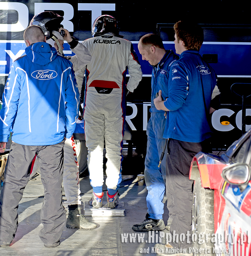 W końcu na serwisie zaczyna się robić nerwowo. Pojawiają się pierwsi fotoreporterzy, jest już TV… Jest, jest, jest Robert! Fiesta została w parku zamkniętym, a On idzie spokojnie w naszą stronę. Za nim podąża Maciek. Widzą nas już z daleka, a konkretniej naszą rozwieszoną flagę. Mamy znów idealny moment na zdjęcie w komplecie. Wszyscy oczekujący przed stanowiskiem serwisowym przyglądają się całej sytuacji z daleka… kamerzysta Eurosport podbiega, załącza kamerę, ale nie wiemy czy udaje mu się uwiecznić ten moment – chyba nie ma refleksu Kubicy.