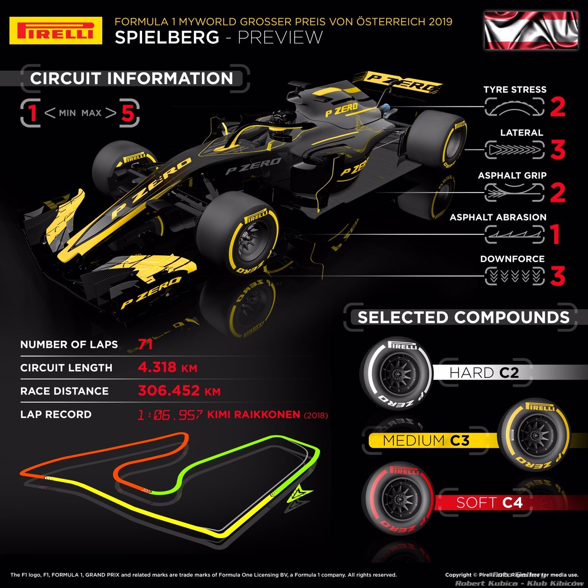 “Podobnie jak w zeszłym roku, mamy dokładnie taką samą nominację dla Austrii, jaką mieliśmy dla Francji, przy czym wyścigi znów dzieli tylko jeden tydzień, o tej samej porze roku. Różnica polega na tym, że mieszanki 2019 są rozmieszczone bardziej równomiernie, co powinno zachęcać do bardziej zróżnicowanych strategii pit stopu i lepszych wyścigów. Austria to niezwykły tor, z dużą ilością ślepych zakrętów i nieprzewidywalnych elementów, takich jak pogoda i ruch uliczny. Oznacza to, że potrzebna jest duża pewność siebie, jak również właściwe ustawienie, aby jak najlepiej wykorzystać opony na tym krótkim torze i zmaksymalizować wszystkie pojawiające się możliwości, również w zakresie strategii. Spielberg to tor, na którym w przeszłości zawsze mieliśmy problemy z pęchęrzykowaniem opon. Jesteśmy pewni, że w ten weekend zobaczymy różnicę w oponach o specyfijkacji na 2019 rok.”