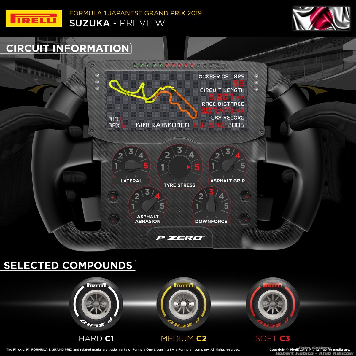 “Japonia jest zawsze jednym z najbardziej ekscytujących i nieprzewidywalnych wyścigów roku, a Suzuka to oldschoolowy tor nagradzający odwagę i zaangażowanie. Ze względu na duże wymagania na zakrętach, wybraliśmy najtwardszą możliwą kombinację w naszym asortymencie, która powinna pomóc kierowcom w osiągnięciu maksimum, nawet przy strategii jednego Pit Stopu.”